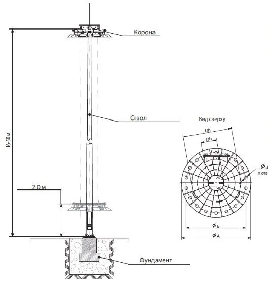 Многогранная прожекторная опора (мачта) МПО-20/5-М(8)-II